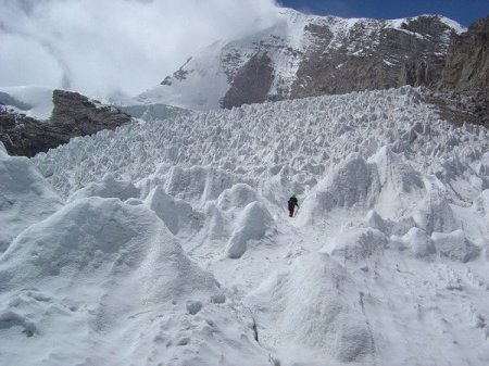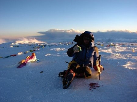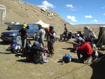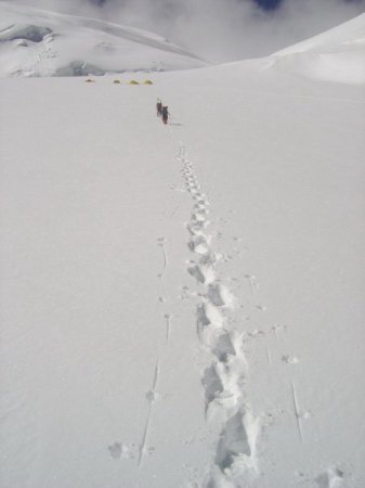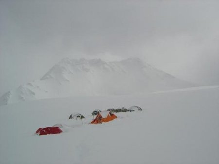Ko se na koncu privlečem na vrh grebena in v kotanji pod sabo zagledam tabor 1 na višini 6.400m ne morem verjeti, da mi je uspelo. Brez pretiravanja lahko rečem, da še nikoli nisem tako fizično nastradal. Tu me že čaka Damjan, besen, ker mora sam kopati plato za šotor. Pa v noge ga zebe, pa transportka "je za v en k..", pa šotor je J . Ja, dobro sva zdelana J za popizdit Pogledam na uro. Od ABC do tukaj sem porabil 5 ur in 45 minut. Ni slabo saj so mi v taboru rekli, da prvič potrebuješ nekje 7 ur. Damjan, človek-stroj je porabil še kakšno uro manj. Še eno uro porabiva, da izkopljeva dovolj velik prostor za šotor in ga postaviva. Sicer sva se potem, ko postaviva šotor, nameravala vrniti. Ko pa sem enkrat bil v zavetju šotora, zunaj pa se je sneženje okrepilo, sem si v trenutku premislil. Tudi nisem hotel iskati poti po ledeniku v temi. Damjan se loti kuhanja juhe in čaja, jaz pa vzamem 2 tableti za želodec, ki mi ju je dal Američan malo prej. Preden zaspiva, oblečeva puhovke in enotno ugotoviva, da smo nastradali. Danes sva spoznala razliko med sedem tisočakom in osem tisočakom.