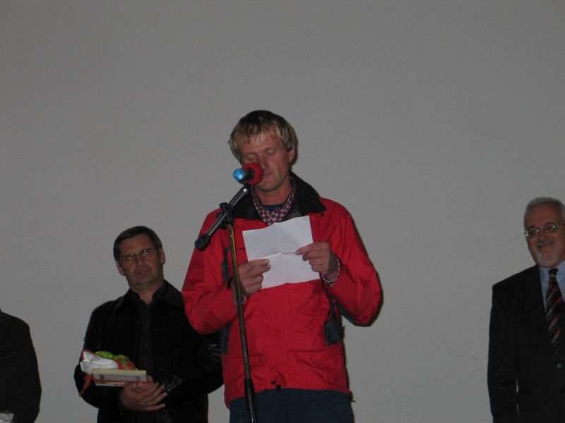 Damjan je letos že prejel občinsko priznanje,kot najboljši športnik v občini v letu 2006. Vendar se njegovi uspehi kar vrstijo. Zato vabim župana občine Lovrenc, gospoda Franca Ladineka, da prevzame besedo. Na oder vabim tudi Damjana. In ker je Damjanov uspeh delček uspeha celotne odprave, vabim celotno odpravo, da se nam pridruži. Vabim tudi Boruta Cotiča, da v imenu Občine, odbora za šport, preda Damjanu spominsko plaketo.